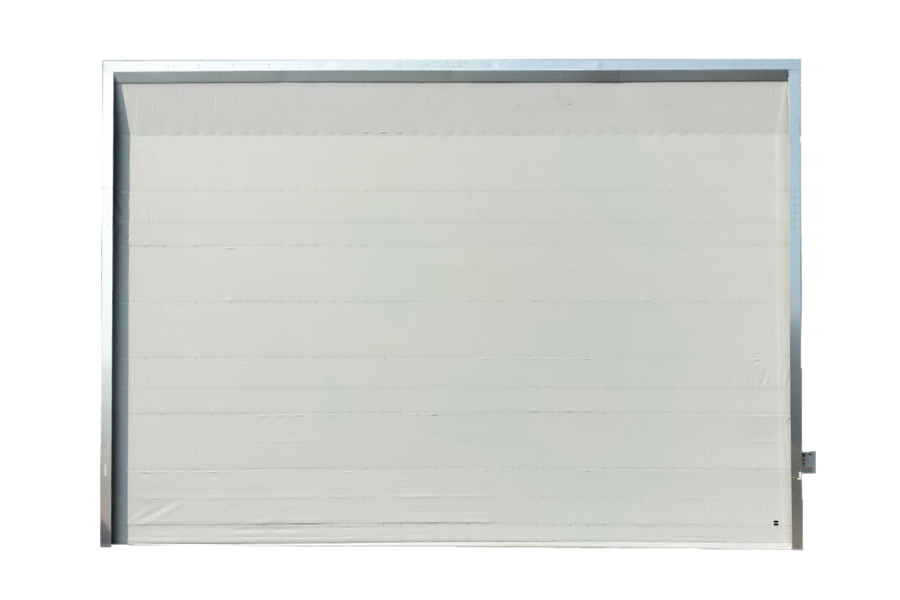 The door curtains are made of sections connected by horizontal wind bars. As the door opens, these sections literally ‘fold up’, stacking vertically on top of each other.